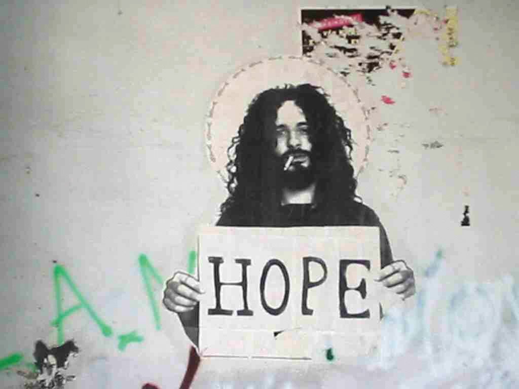 Hope has been showing up in my writing for at least a decade. During a trip to Greece in 2006, I kept coming across these paste-ups, around the inner neighbourhoods of Athens, of black-and-white portraits accompanied by the word “HOPE”. I photographed and wrote about them, telling anyone who’d listen how beautiful they were to me. I was in particular need of some hope at that time, so my encounter with these images were all the more moving for it. I later discovered that they were by Konstantinos Ntagkas, the Greek artist who goes by the alias “H.O.P.E”. After being introduced to Ntagkas by mutual friends, we began corresponding. Then, in 2009—during the early days of the Greek financial crisis, when a version of hope was being peddled by the European Union in return for harsh financial austerity measures—Ntagkas asked me to write the introduction to his first book, which I wrote as a prose poem. It opens: